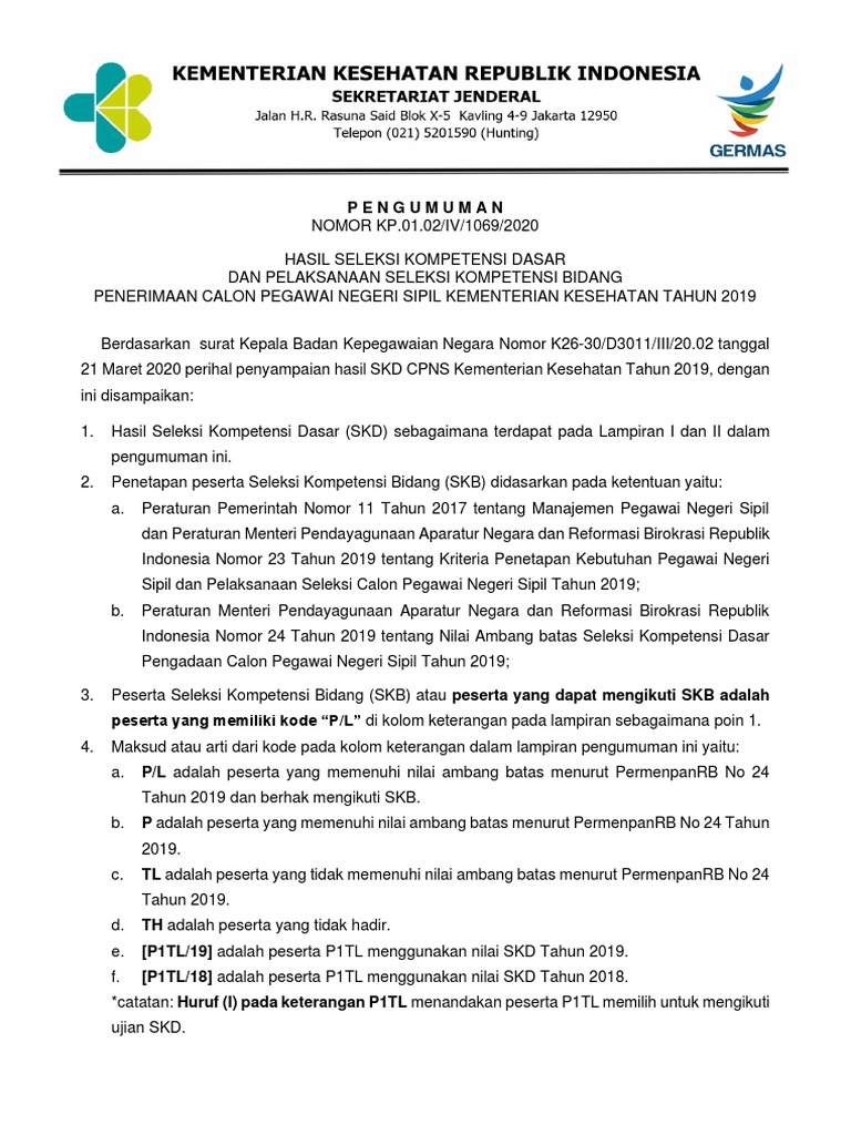 Info terbaru seleksi cpns ! Selamat datang di laman seleksi penerimaan cpns. Hasil seleksi administrasi pada seleksi calon pegawai negeri sipil. Lokasi seleksi kompetensi dasar cpns gratis download contoh soal tes cpns cat skd kemenkes 2019 2020, klik beberapa tautan di download pengumuman hasil tes skd cpns kemenkes 2019 2020 pdf. Penetapan hasil seleksi tahap i cpns 2019 tersebut berdasarkan pengumuman nomor kp.01.02/iv/1187/2019 tentang hasil seleksi administrasi pada seleksi cpns kementerian kesehatan tahun 2019, yang ditandatangani oleh sekretaris jenderal kemenkes oscar primadi pada 19.