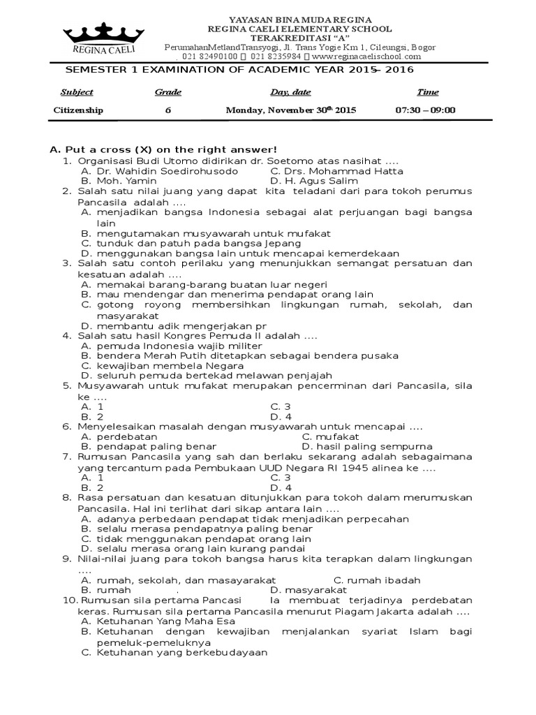 Dibawah ini adalah prediksi soal ujian sekolah (us) pelajaran pkn untuk tingkat sd kelas 6 yang terdiri dari 35 soal pkn pilihan ganda dan 5 soal pkn uraian/essay. Soal uts pkn sd kelas 6 semester 1 (gasal) dan kunci jawaban. Soal ujian sekolah us mata pelajaran pendidikan kewarganegaraan pkn kelas 6 sdmi dan kunci jawaban_soal uas pilihan ganda mapel pkn ktsp yang berjumlah 50 butir ini bisa anda manfaatkan sebagai bahan belajar untuk menghadapi ujian sekolah tahun pelajaran 20162017 maupun 20172018 dan dapat juga dimanfaatkan untuk bahan latihan soal bagi siswa. Ipa tema 9 sd kelas 6. Kerjakanlah soal yang menurut kalian mudah. Proses globalisasi akan terus berjalan, bahkan dalam proses perkembangannya, globalisasi akan berdampak terhadap kehidupan manusia. Kemudian periksa kembali jawaban sebelum kalian memberikannya pada guru kalian. There was a problem previewing soal uts pkn kelas 6 semester 2.pdf. Ulangan ipa tema 9 sd kelas 6. Berikut soal ujian sekolah (us) pendidikan kewarganegaraan (pkn) kelas 6 sd kurikulum 2013 dan kunci jawaban seperti di bawah ini : Pada kali ini, kami akan membagikan salah satu soal yang dapat digunakan sebagai latihan dalam mengukur kemampuan siswa (peserta didik), yaitu siswa kelas 6 sd pada mata pelajaran pendidikan pancasila dan kewarganegaraan semester 1. Contoh soal pkn kelas 6 soal ujian sekolah us mata pelajaran pendidikan kewarganegaraan pkn kelas 6 sdmi dan kunci jawaban_soal uas pilihan ganda mapel pkn ktsp yang berjumlah 50 butir posingan terbaru. Hide 1 soal try out pkn kelas 6 2020 1.1 i.